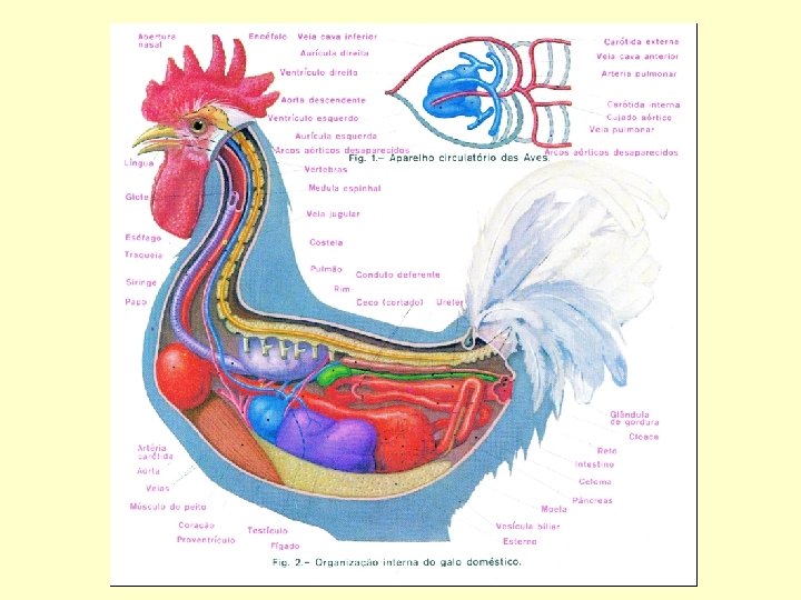 Aparelhos urogenitais do galo doméstico, em vista ventral. A cloaca está aberta para mostrar as saídas dos ductos.