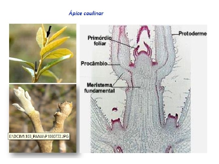 Meristemas primários Meristema Apical Caulinar Primórdio foliar Meristema apical caulinar Primórdido de gema axilar Meristema fundamental = preenchimento Procâmbio = xilema e floema Protoderme = epiderme