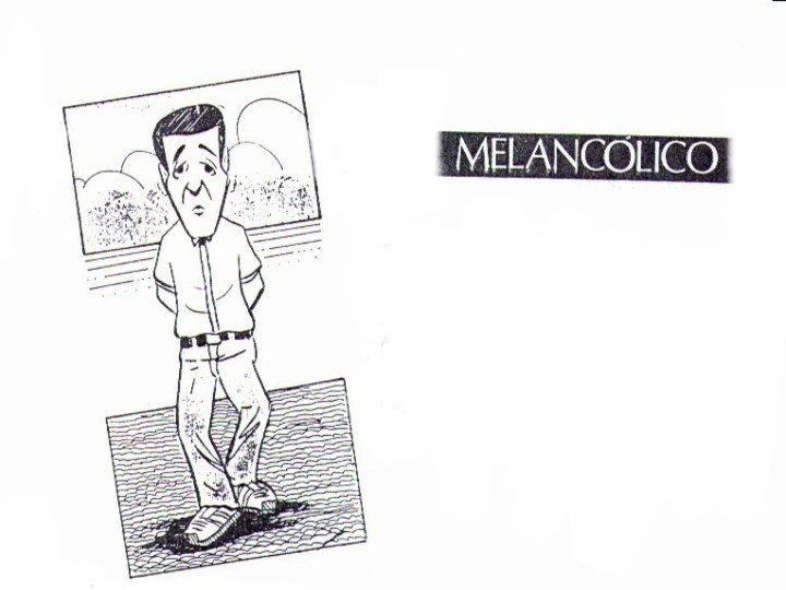 Melancólico - Emoções • Favoráveis Natureza rica e sensível. Ama a música e a arte. Habilidade para analisar. Pensador profundo e reflexivo. Reage fortemente à emoção. • Debilidades - Triste e deprimido. Pessimista, sempre vê o lado negativo das coisas. Gosta de sofrer, ser mártir. Enfermo imaginário. Introspectivo ao ponto de prejudicar-se. Orgulhoso.