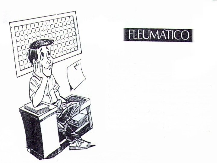 Fleumático – Emoções • • • Favoráveis Tranqüilo e digno de toda confiança Bom por natureza e fácil de conviver com ele Contente e satisfeito ainda que não tenha muito para dizer Francamente amável Amante da paz • • Debilidades Falta de confiança em si mesmo Pessimista e temeroso Apreensivo Raramente se ri a gargalhadas Passivo e indiferente Contemporizante Tem muito senso de justiça própria