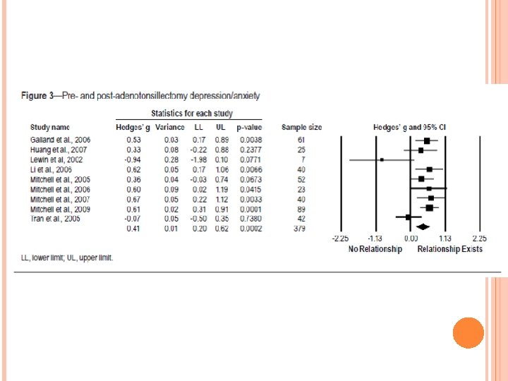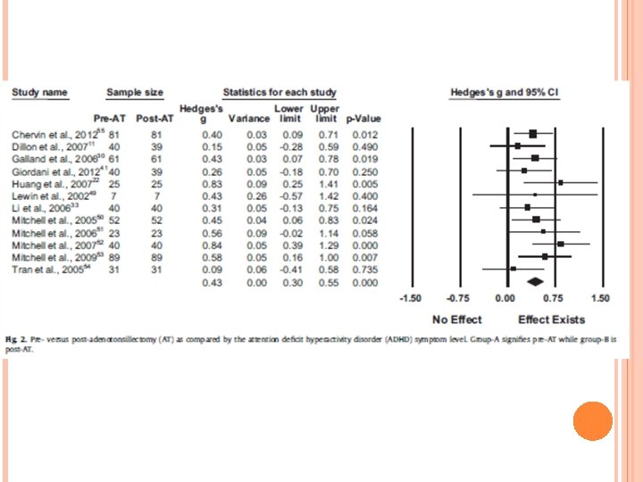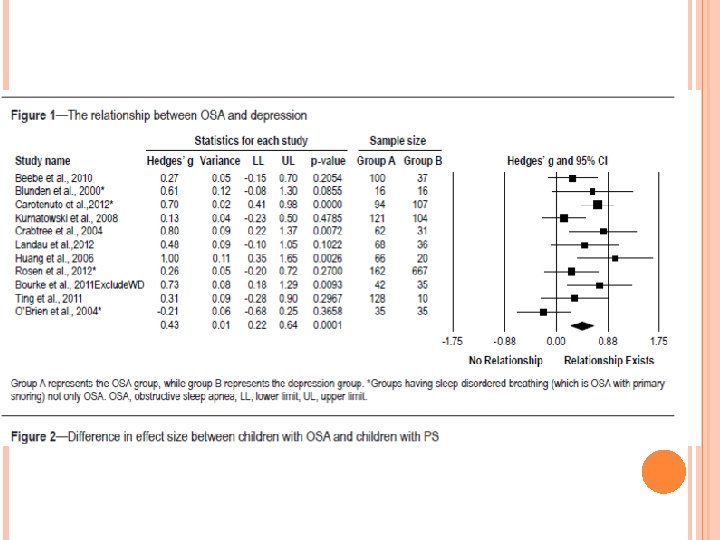 ADHD AND OSA Systematic review and meta-analysis Case controlled analysis n=1113 in treatment group, n=1405 in watchful waiting Mean age 8 years old Medium relationship between OSA and ADHD symptoms Medium relationship effect with T&A 13 month follow up Sedky K, Be. Amiri S, Abdollahi. Fakhim S, Lotfi A, Bayazian G, Sohrabpour M, Hemmatjoo T. Int J Pediatr Otorhinolaryngol. 2015 Aug; 79(8): 1213 -7 Bennett DS, Carvalho KS. Sleep Med Rev. 2014 Aug; 18(4): 349 -56