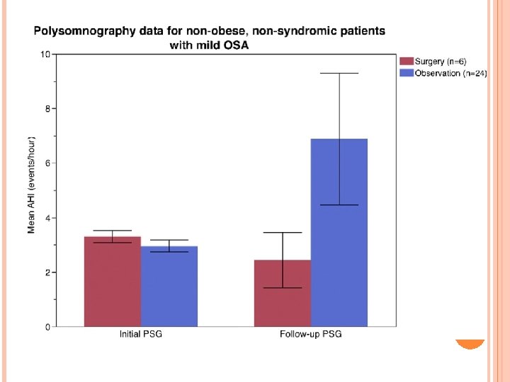 IT’S JUST MILD APNEA For mild apnea specifically, T&A better than watchful waiting Studied retrospectively T&A group mean reduction in AHI from 3. 5 to 2. 69 Observation group worsened from 3. 09 to 5. 18 Average time for post op PSG 10 months Exception – obese children had no difference between groups What’s mild? In this study, considered AHI between 1 and 5 What’s cure? Trosman SJ, Eleff DJ, Krishna J, Anne S. Int J Pediatr Otorhinolaryngol. 2016 Apr; 83: 25 -30