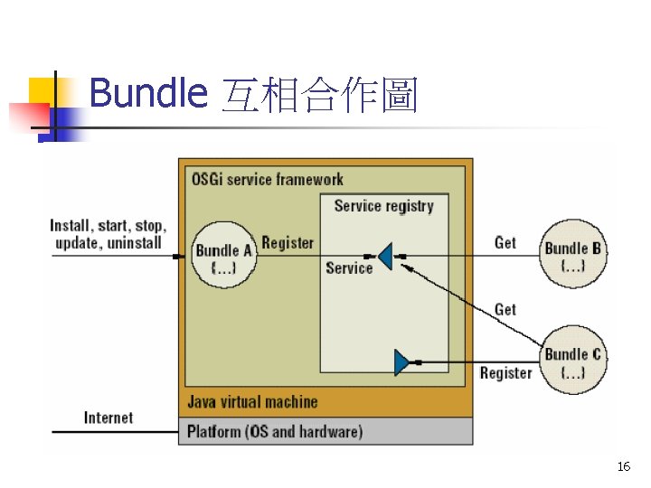 OSGi的優點 n Platform Independent n Application Independent n Secure n Multiple Services n Multiple Local Network Technologies n Multiple Device Access Technologies n Co-existence with Other Standards 12