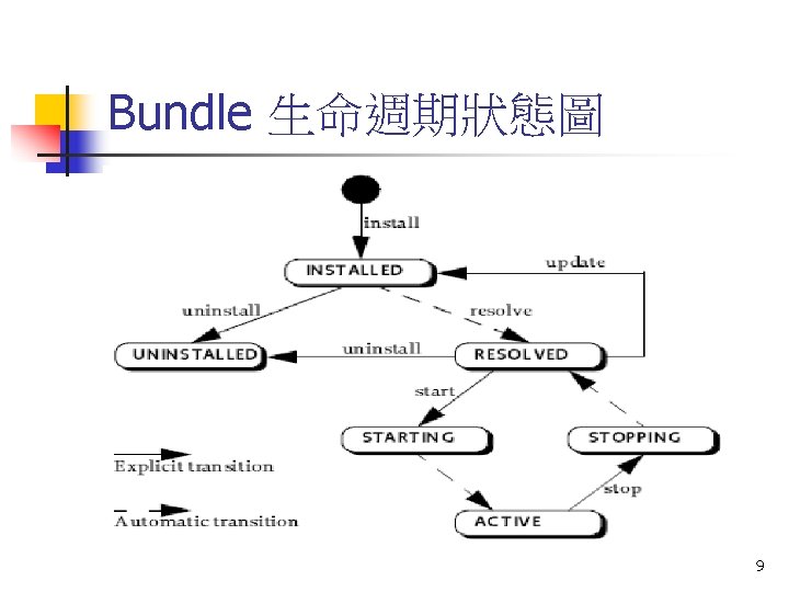 OSGi bundle n Bundle 是一個Java Archive(JAR)檔案,該 JAR 檔 包含 Java類別(Class)、啓動類別(Activator Class)、清單文件檔(Manifest Header)和一些資 源檔(如HTML 網頁或JPG 圖檔等)。 7