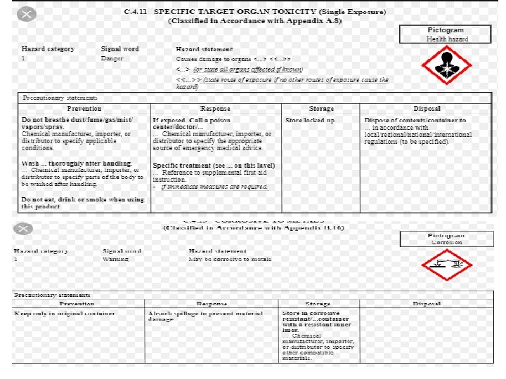 New Labelling Requirements • • Pictogram: uses a symbol plus other graphic elements to convey specific information about the hazards of a chemical. Each pictogram consists of a different symbol on a white background within a red square diamond frame. The system requires the use of nine pictograms. However, OSHA requires the use of only eight pictograms under the revised standard. Signal words: include danger and warning, to indicate the relative level of the severity of hazard. Use danger for severe hazard and warning for less severe hazards. Hazard statement: a statement assigned to a hazard class and category that describes the nature of the hazards of a chemical. It also includes the degree of hazard. Precautionary statement: describes recommended measures to minimize or prevent adverse effects that could result from exposure to a hazardous chemical. It also applies to the improper storage or handling of a hazardous chemical. The revised standard requires the printing of all red borders on the label with a symbol printed inside. Chemical manufacturers, importers, distributors, or employers who become aware of any significant information regarding the hazards of a chemical must revise labels within 6 months of becoming aware of the new information. Employers can label workplace containers with the same label affixed to the shipped containers. Employers can also use label alternatives, including those described in NFPA 704, Hazard Rating and the Hazardous Material Information System. However, the information supplied on alternative labels must meet the requirements of the revised standard with no conflicting hazard warnings or pictograms.