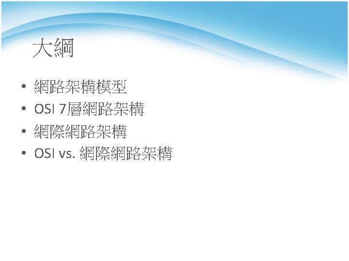 OSI Model 7層的主要功能 OSI Layer Equipment Data Unit 7 Application Protocol Gateway Program HTTP, FTP, Telnet, SMTP, POP 3, 4 Transport Layer 4 Switch Message TCP, UDP, 3 Network Router Packet or Datagram IP, ARP, RARP 2 Data Link Switch, Bridge Frame Ethernet, 1 Physical Repeater, hub Bit Fiber 6 Presentation 5 Session