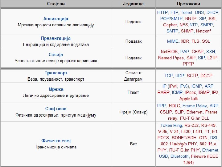 OSI (Open System Interconnection) mrežni model q Nastao kao rezultat rada ISO (International Organization for Standardization) organizacije, započetog krajem 70 -ih godina prošlog veka. To je apstraktni i konceptualni opis dizajna protokola komunikaciskih i računarskih mreža, predstavljen u obliku sedam slojeva: • Fizički sloj (Physical Layer) • Sloj veze (Data link layer) • Mrežni sloj (Network Layer) • Transportni sloj (Transport Layer) • Sloj sesije (Konferenciski, Sednički ili Razgovorni sloj - Session Layer) • Prezentacijski sloj (Presentation Layer) • Aplikaciski sloj (Application Layer).