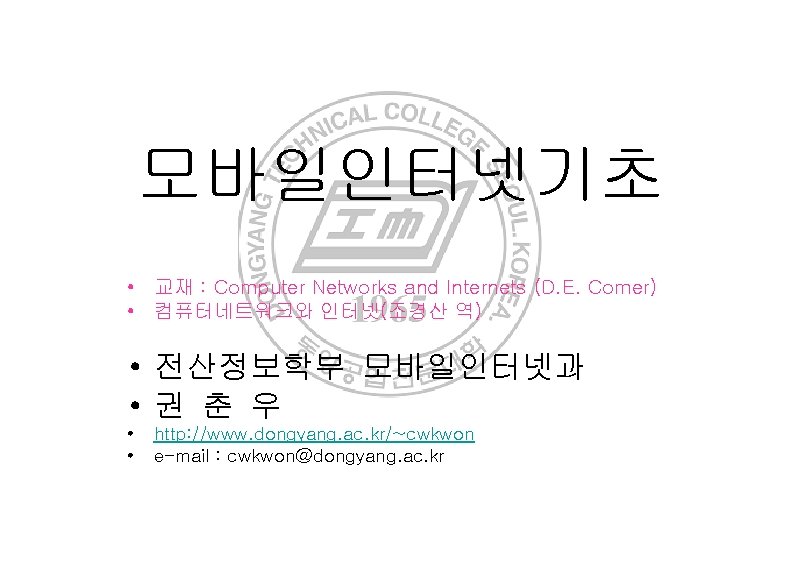 [요약] OSI 모델과 TCP/IP 프로토콜 1 OSI 모델 2 OSI 모델의 계층 3 TCP/IP 프로토콜 4 주소지정 5 TCP/IP 동작 과정 6 TCP/IP 버전 강좌 : 모바일인터넷기초 Choon Woo Kwon 2 School of Computing & Information Department of Mobile Internet