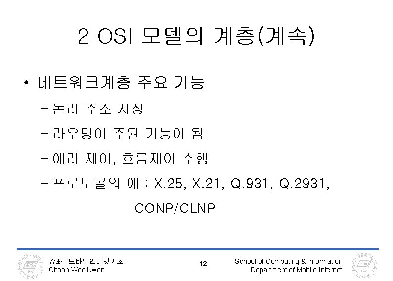 2 OSI 모델의 계층(계속) • 네트워크계층(network layer) – 패킷(packet)을 네트워크를 통하여 발신지에서 목 적지까지 전달 책임 강좌 : 모바일인터넷기초 Choon Woo Kwon 11 School of Computing & Information Department of Mobile Internet