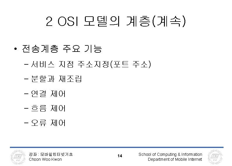 1 OSI 모델(계속) • OSI 모델 강좌 : 모바일인터넷기초 Choon Woo Kwon 4 School of Computing & Information Department of Mobile Internet
