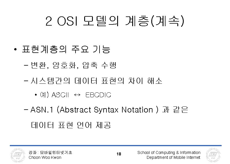 2 OSI 모델의 계층(계속) • 표현계층(presentation layer) 강좌 : 모바일인터넷기초 Choon Woo Kwon 17 School of Computing & Information Department of Mobile Internet