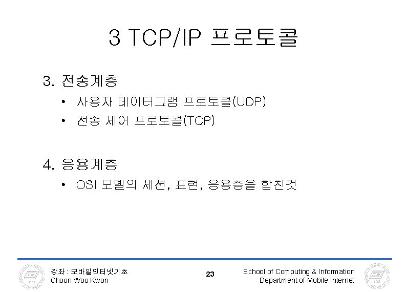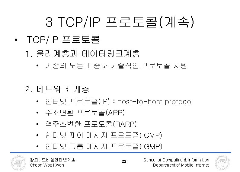 3 TCP/IP 프로토콜 • TCP/IP와 OSI 모델 강좌 : 모바일인터넷기초 Choon Woo Kwon 21 School of Computing & Information Department of Mobile Internet