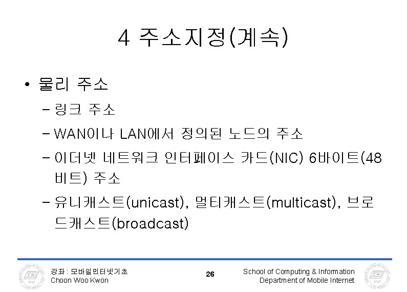 4 주소지정(계속) • TCP/IP에서 주소와 계층간의 관계 강좌 : 모바일인터넷기초 Choon Woo Kwon 25 School of Computing & Information Department of Mobile Internet