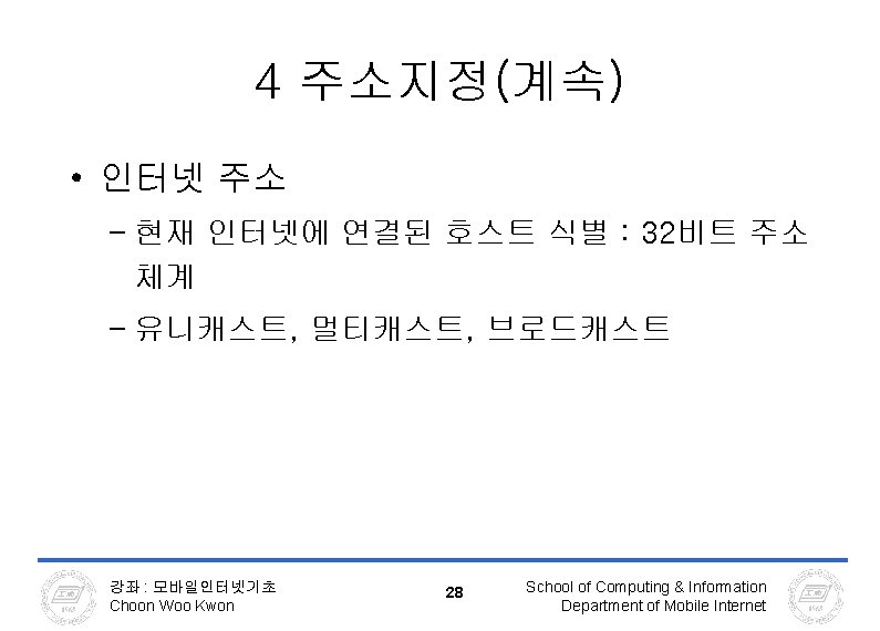 4 주소지정(계속) • IP 주소 강좌 : 모바일인터넷기초 Choon Woo Kwon 29 School of Computing & Information Department of Mobile Internet