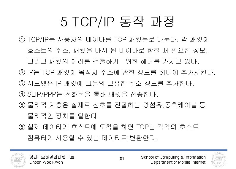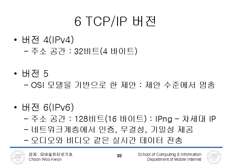 5 TCP/IP 동작 과정 강좌 : 모바일인터넷기초 Choon Woo Kwon 32 School of Computing & Information Department of Mobile Internet