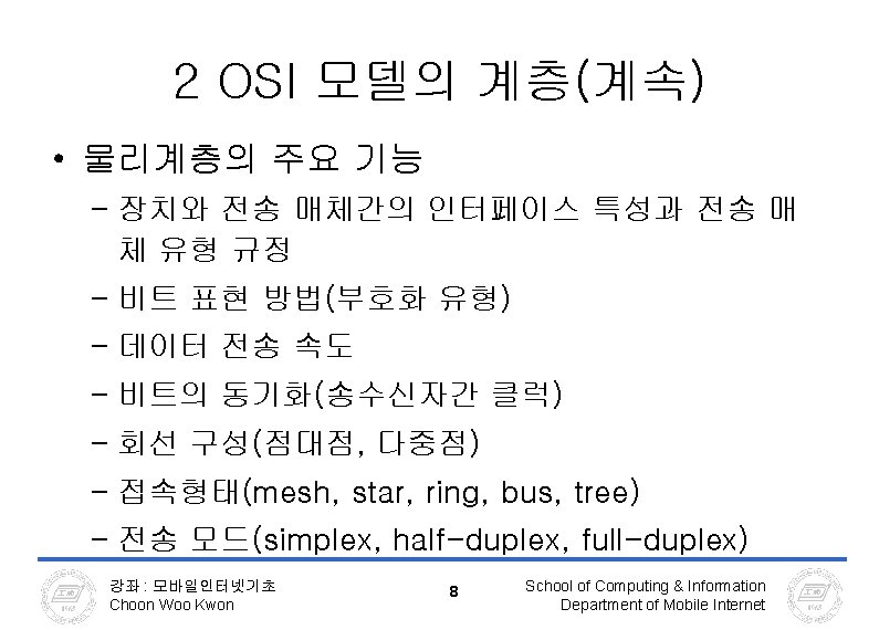 2 OSI 모델의 계층 • 물리계층(physical layer) – 물리적인 매체를 통하여 비트 스트림을 전송하는데 필요한 기능 제공 강좌 : 모바일인터넷기초 Choon Woo Kwon 7 School of Computing & Information Department of Mobile Internet