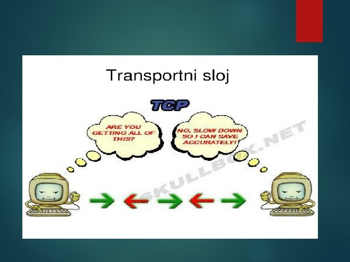 Transportni sloj § Transportni sloj : zadužen je za pouzdan prenos podataka između uređaja. Otkriva i ispravlja greške u prenosu (traži ponovno slanje). Uspostavlja, održava i prekida virtualne krugove (virtual circuit). Primer virtualnog kruga je telefonski poziv. Korisnik bira broj, uspostavlja vezu i priča sa sagovornikom. Za celo to vreme trajanja poziva između njih postoji virtualni komunikacioni krug. Nakon završetka razgovora jedan od sagovornika prekida vezu (virtualni krug). Jedan od važnijih protokola na ovom sloju je TCP (Transmission Control Protocol).
