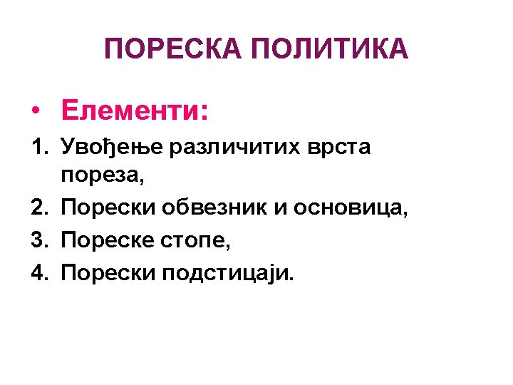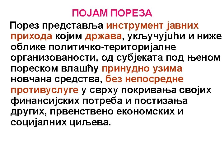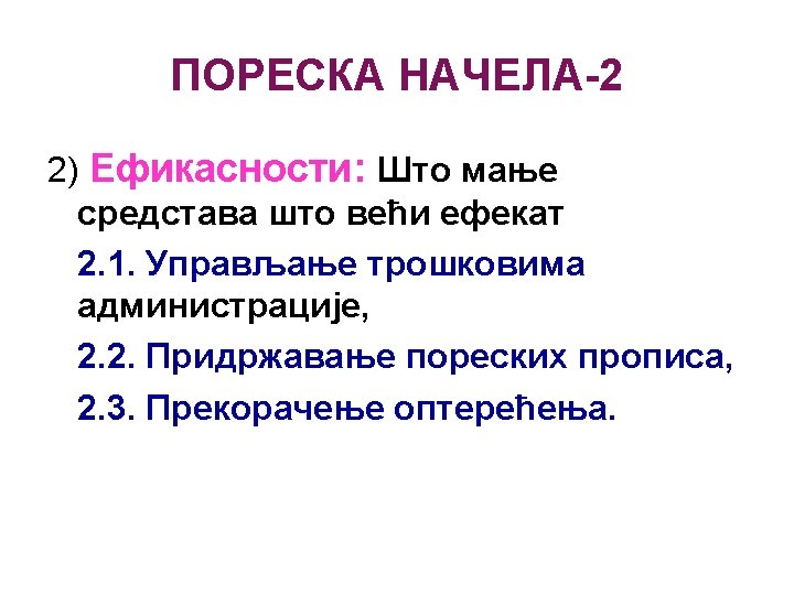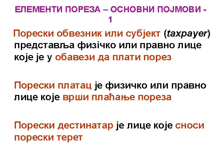 OSNOVNE NAPOMENE Šta se očekuje od poreskog sistema: Ø Ekonomska efikasnost – alokacija resursa, Ø Administrativna jednostavnost – jeftin i jednostavan za primjenu, Ø Fleksibilnost – mogućnost brzog prilagođavanja izmjenjenim ekonomskim okolnostima, Ø Politička odgovornost – definisan da svako zna šta plaća, kada i koliko, Ø Pravičnost – da se na jednak način odnosi prema poreskim obveznicima približno iste ekonomske snage.