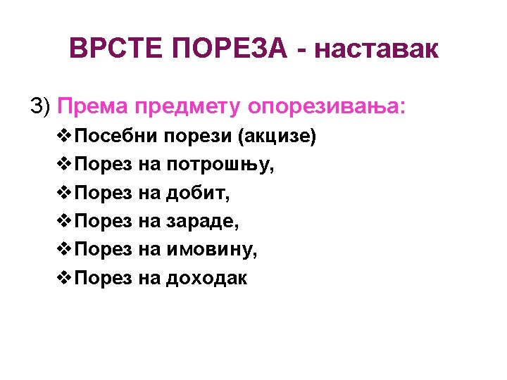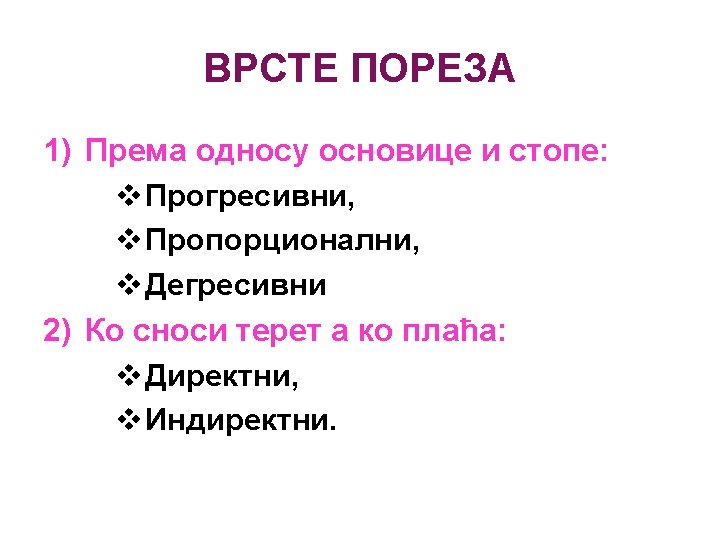 OSNOVNE NAPOMENE Vrste direktnih poreza: Ø Porez na zarade, Ø Porez na prihod građana (na dohodak), Ø Porez na dobit, Ø Porez na imovinu, Ø Porez na poklone, Može se oporezivati: § Pojedinac, § Porodica. Stope mogu biti: o Proporcionalne, o Progresivne