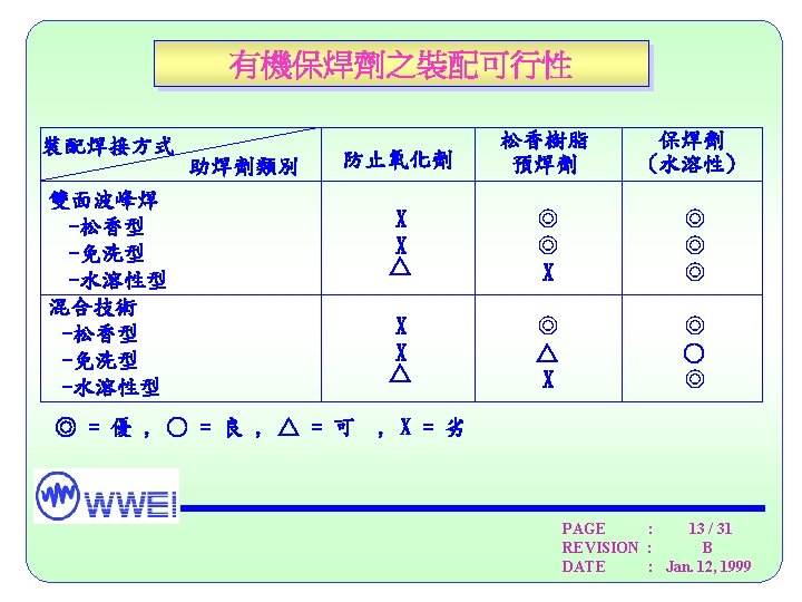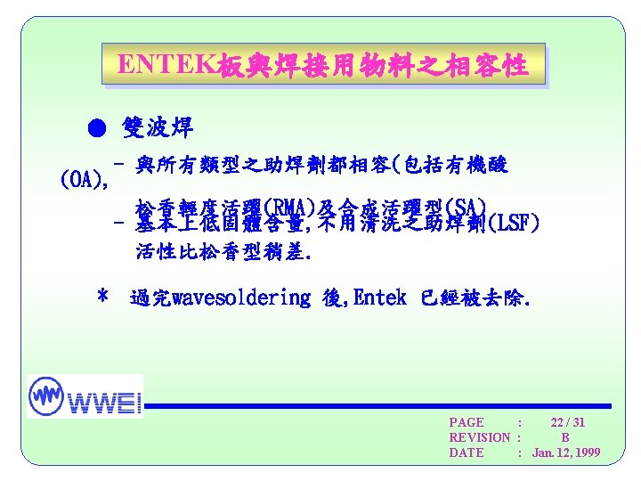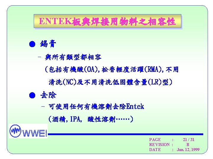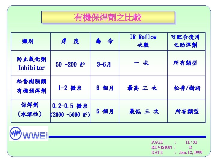 有機保焊劑之種類 類別 * 防止氧化劑(Anti-Oxidants) - ENTEK CU-56 * 松香樹脂類有機預焊劑(Rosin/Resin Pre. Fluxes) * 水溶性預焊劑 - 有機保焊劑 (OSP) - ENTEK PLUS CU-106 A PAGE : 8 / 31 REVISION : B DATE : Jan. 12, 1999