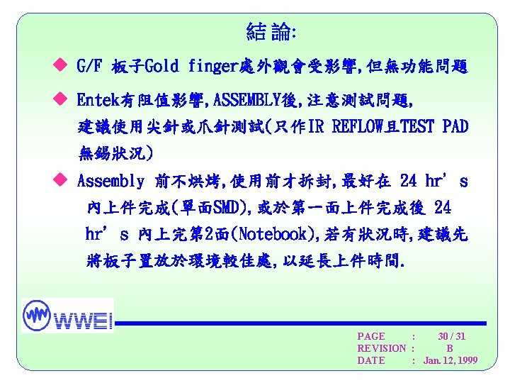 Cu-56 與 Cu-106 A比較 Cu-56為 Mono Layer Cu-106 A為Multi-Layer Cu Cu 只適合單次reflow 適合多次reflow(3~5次) PAGE : 9 / 31 REVISION : B DATE : Jan. 12, 1999