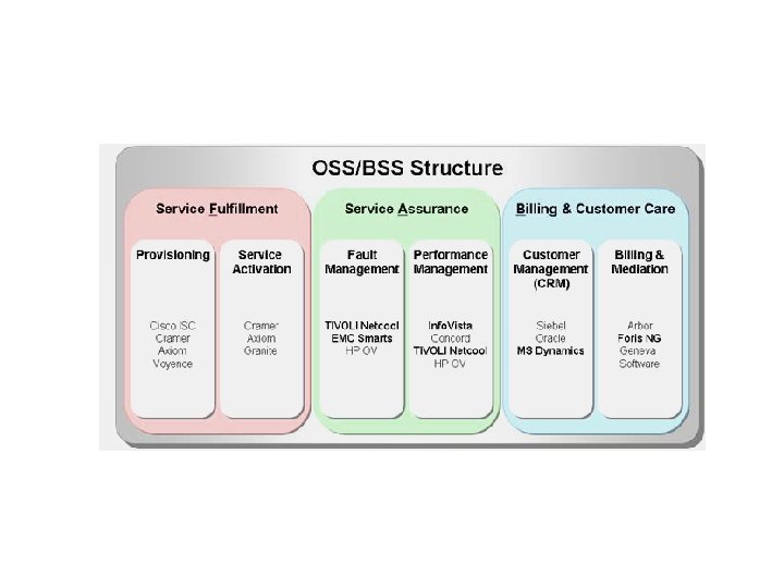 FCAPS Fault Configuration Accounting Performance Security TMN Business Management No No Yes Yes Service Management Yes Yes Yes Network Management Yes No Yes Element Management Yes No Yes OAM&P Operation Yes No No Yes No Administration No No Yes Yes Maintenance Yes No Yes Provisioning No Yes No No No TOM / e. TOM Fulfillment No Yes No No No Assurance Yes No No Yes Billing No No Yes No no Operation Support No No No