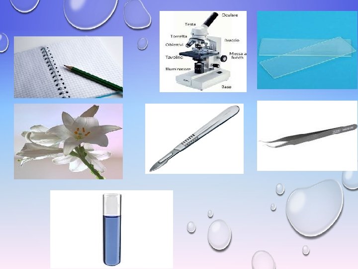 Materiale occorrente Che cosa occorre per eseguire queste osservazioni? Occorre: una pinzetta, un microscopio, vetrini, bisturi, fiore, provetta ed un quaderno con una matita