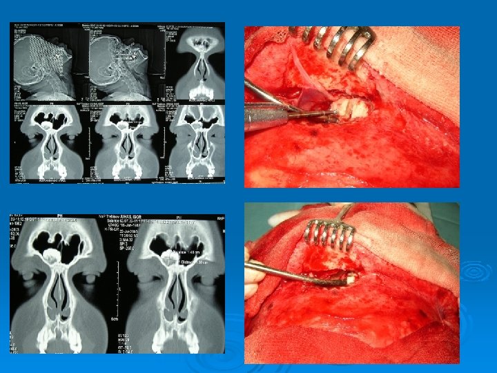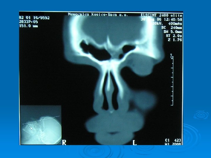 Kazuistika č. 1 – 24 ročný pacient I. J. Subj: asi 2 roky bolesti hlavy, opakovane sinusitídy, polyvalentná alergia, liečený na hypertenziu a DM I typu, otec nosové polypy CT PND: 3 cm osteóm na spodine ľ. čelovej dutiny v oblasti vývodu, cysta ľavej maxil. dutiny, závojovanie ľavých ethmoidov Op. liečba: osteoplastická operácia ľ. čelovej dutiny, FESS vľavo ( STA, etmoidektómia, frontotómia) Histológia: Osteoid osteoma