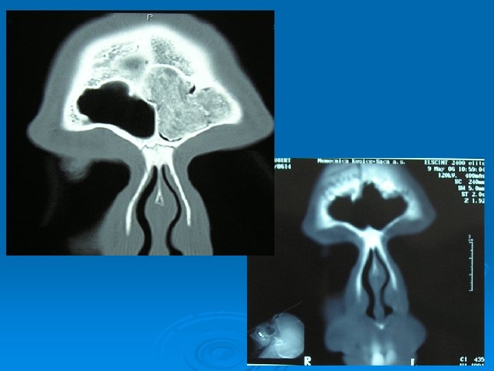 Osteóm frontálnej dutiny - symptómy bolesti hlavy - rôznej intenzity a kvality ! nekorelujú s veľkosťou nádoru ! palpačná citlivosť recidivujúce sinusitídy očné príznaky - slzenie, protrúzia bulbu neurologické príznaky - opakované meningitídy, absces mozgu kozmetické zmeny ( deformita v čelovej oblasti. . . )