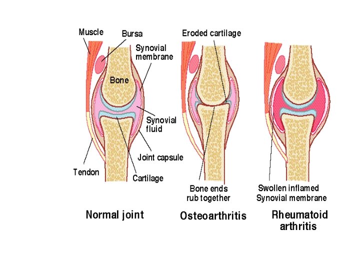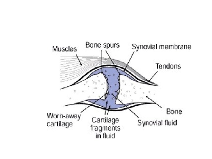Clinical features 2 • Movement abnormalities – ‘Gelling’: stiffness after periods of inactivity, passes over within minutes (approx 15 min. ) of using joint again – Coarse crepitus: palpate/hear (due to flaked cartilage & eburnated bone ends) – Reduced ROM: capsular thickening and bony changes in joint, ms. Spasm or soft tissue contracture.
