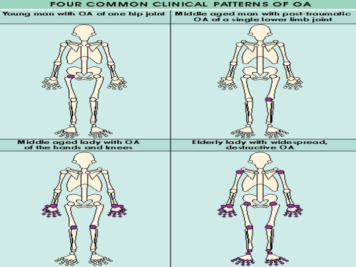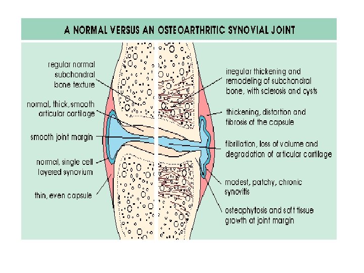 Risk factors Obesity esp OA knee Abnormal mechanical loading eg. meniscectomy, instability Inherited type II collagen defects in premature polyarticular OA Inheritance in nodal OA Occupation eg farmers Infection: Non-gonococcal septic arthritis Hereditary