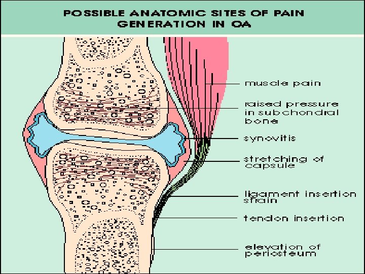 Clinical features of OA Pain Stiffness Muscle spasm Restricted movement Deformity Muscle weakness or wasting Joint enlargement and instability Crepitus • Joint Effusion