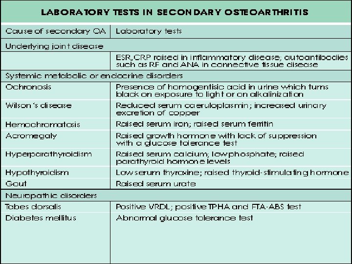 Special Investigations • Blood tests: Normal • Radiological features: – Cartilage loss – Subchondral sclerosis – Cysts – Osteophytes