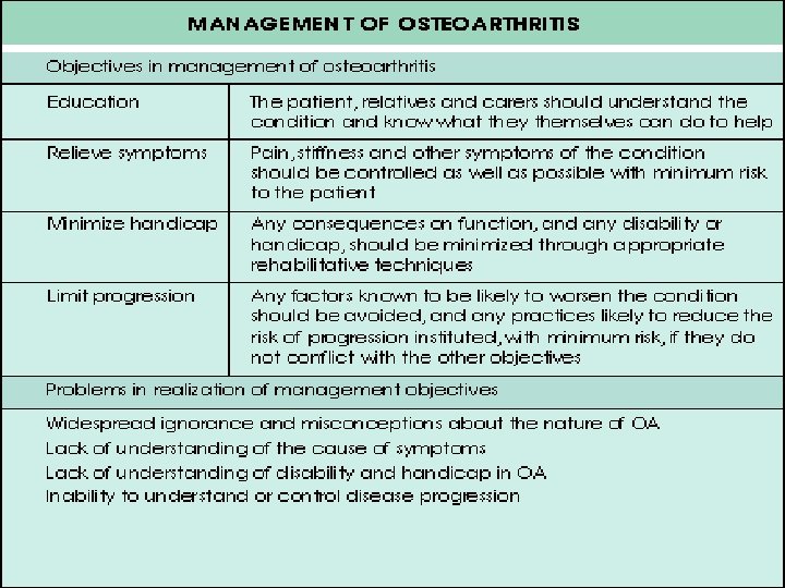 Education • Nonsystemic nature of disease • Prevent overloading of joint. Obesity!! • Appropriate use of treatment modalities – Importance of exercise program – Aids, apliances, braces – Medial treatments – Surgical treatments