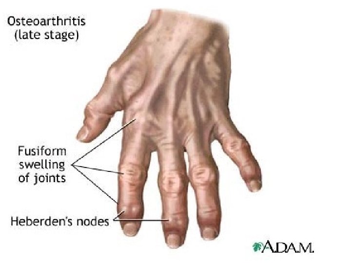 Nodal Generalised OA • • Heberden’s nodes • Bouchard’s nodes • CMC of thumb • Hallux valgus/rigidus • Knees & hips • Apophyseal joints