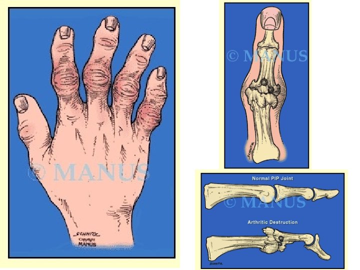 Clinical features 3 • Deformities – Soft tissue swelling: • mild synovitis • small effusions – Osteophytes – Joint laxity – Asymmetrical joint destruction leading to angulation