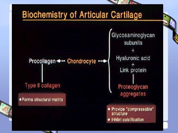 Cartilage • Consist of : – Water : 70% – Type II collagen – Proteoglycan : • Aggrecan Sub Unit – Core Protein – Glycosaminoglycans, Link Protein • Hyaluronic Acid – Chondrocyte