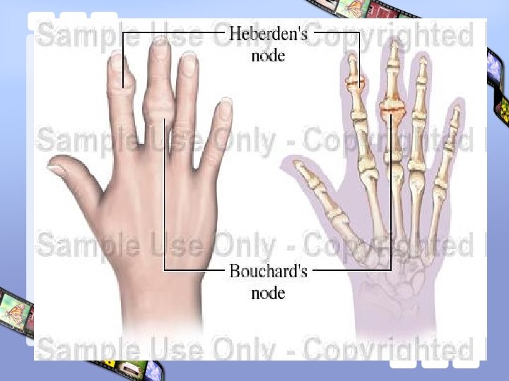 Artherosis of hand’s joints • F/m : 4/1 • • • 20 -65 ( >45 ) years Hereditary: 50% Associated with Knee disease & obesity DIP ( Heberden’s node ) PIP ( Buchardd’s node ) CMC 1 ( Rhizarthrosis )