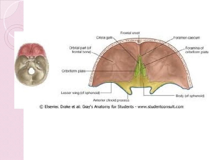 Fosa Craneal Anterior � Ocupada porciones anterior e inferior de los lóbulos frontales del cerebro � Esta constituida: Delante hueso frontal Centro hueso etmoides Detrás cuerpo y alas menores del esfenoides La mayor parte está formada por el h. Frontal � Orificio Ciego � Crista galli: A cada lado se encuentra la lámina cribiforme del etmoides. Que por sus orificios pasan los nervios olfatorios