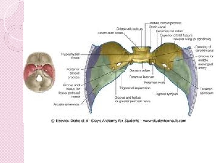A cada lado de la base del cuerpo del esfenoides se observan 4 orificios: � Fisura orbitaria superior: superior Ø VV. Oftálmicas Ø NC. Oculomotor- troclear-trigémino y abducens Ø Fibras simpáticas � Orificio redondo: redondo Ø Nervio maxilar � Orificio oval: Ø Nervio mandibular Ø A. meníngea accesoria. � Orificio espinoso: Ø Vasos meníngeos medios �