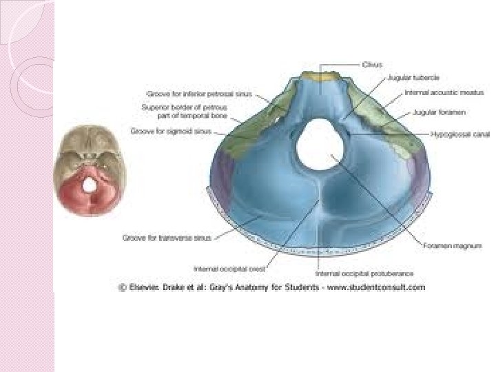 � Clivus: Gran pendiente que llega hasta el orificio magno � La cresta occipital interna con dos grandes impresiones que son las fosas cerebelosas. Termina en la protuberancia occipital interna (confluencia de los senos venosos). v Orificio Yugular: v Conducto auditivo interno v Conducto Hipogloso: Ø NC. hipogloso.
