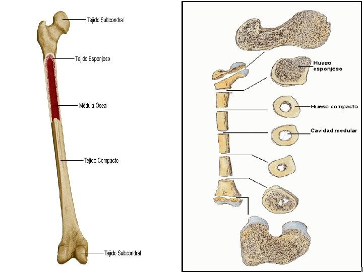 MORFOLOGÍA DE LOS HUESOS Ø La morfología de los huesos varía según varios factores: • El hueso largo presenta una parte central (diáfisis) y dos extremidades (epífisis). • La epífisis es formada por hueso esponjoso con una delgada capa superficial de tejido compacto. • La diáfisis es casi totalmente de tejido compacto con una pequeña parte de tejido esponjoso que delimita el canal medular.