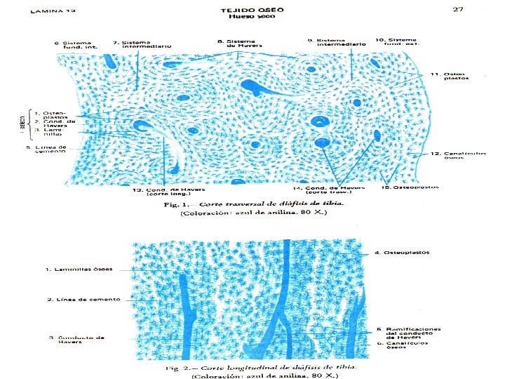 TEJIDO ÓSEO Ø Microscópicamente un hueso está formado por • hueso compacto que no tiene cavidades visibles • hueso esponjoso que posee muchas cavidades intercomunicantes. Histológicamente tienen la misma estructura.