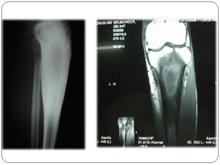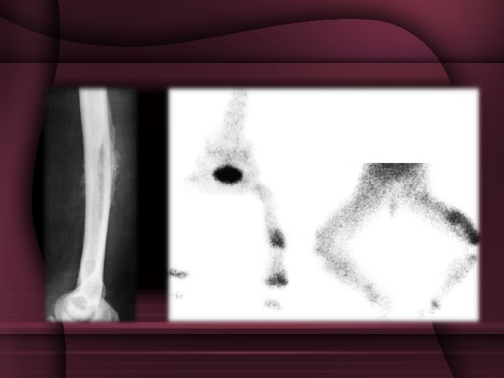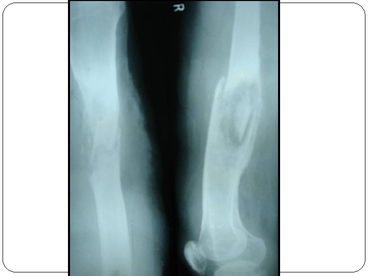 ROENTGENOGRAPHIC FINDINGS Ø Early stages - Moth-eaten appearance. Ø Elevation of periosteum with subperiosteal laminations of new bones. Ø Sharply delineated areas of dense bone with surrounding decalcification. Ø Gradually, necrotic dense area is surrounded by white ring of involucrum. Ø Shaft becomes enlarged and mishapen.