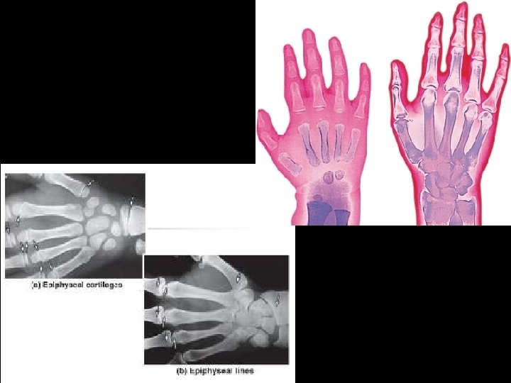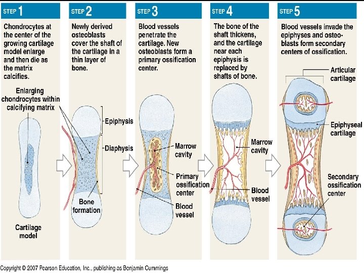 • D. Cartilage is destroyed, beginning in the center of diaphysis – forms primary (10) ossification center - cartilage is replaced w/ bone • E. Secondary (20) ossif. centers form in the epiphyses. Almost all cartilage is replaced with bone – some remains … • F. Artic. cart. remains on the outside of epiphyses at joint surfaces • G. Thin line of cartilage remains (epiphyseal/ growth plate) at border of epiph. and diaph.