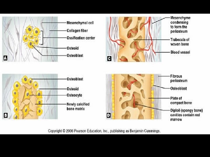 1. Intramembranous bones – (flat bones of skull, mandible, clavicle) A. osteoblasts cluster B. secrete matrix which forms thin plates and becomes spongy bone C. o‘blasts become trapped in lacunae (become o‘cytes); periosteum forms D. o‘blasts in the periosteum form a layer of compact bone over the spongy bone