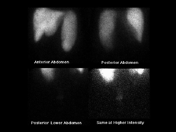 Meckel’s diverticulum • • • 2. 2 m. Ci Tc-99 m pertecnetate, i. v. abnormal focus of activity in the anterior right lower quadrant appears at the same time as normal gastric activity ddx: – active GI bleeding from non-Meckel’s source – ectopic gastric mucosa in jejunal tic (adults) – duplication cyst – inflammation around intussusception (false +)