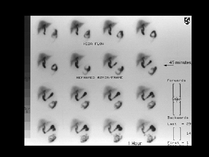 Acute cholecystitis • Findings: – Normal hepatic uptake – Prompt visualization of CBD and small bowel – Non-visualization of GB despite morphine administration – “Rim sign” along inferior right lobe • ddx: – NONE! – This is an Aunt Minnie!