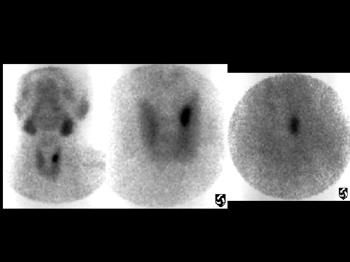 Absent thyroid activity • Findings: – No thyroid activity seen on a 99 m-Tc study • ddx: – Hyperthyroid • painful: – subacute thyroiditis • painless: – exogenous thyroid – Hypothyroid • painless: – Hashimotos's – ablated thyroid – Recent I+ study – Congenital absence (v. rare)