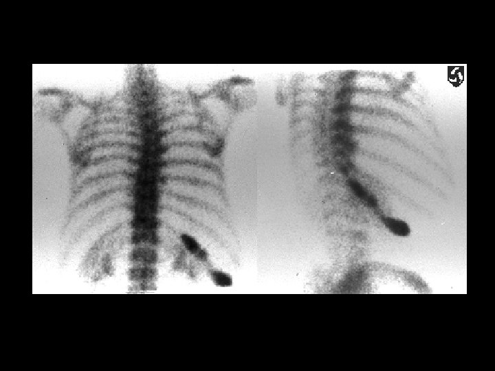 Radiation hypoplasia • Findings: – Bone scan shows a small left ileum, right convex scoliosis, and missing left kidney – Remainder of skeleton is symmetric • ddx: – Hemihypertrophy – Beckwith Wiedemann – Klippel-Trenaunay
